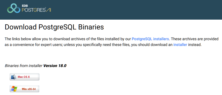 First, we need to download PostgreSQL. The main page for downloads sends you off to the page for Windows downloads which points you to the installer from EDB. However, we don’t want the installer binary – so, we head on to the page that hosts the ZIP archive instead.