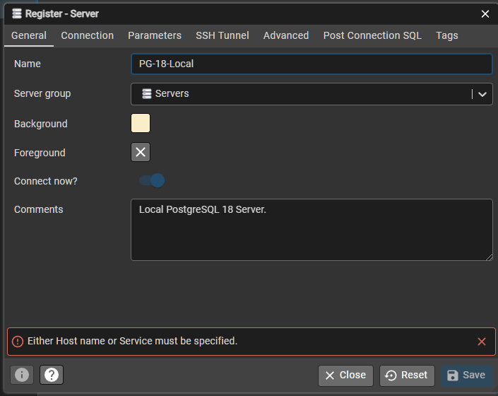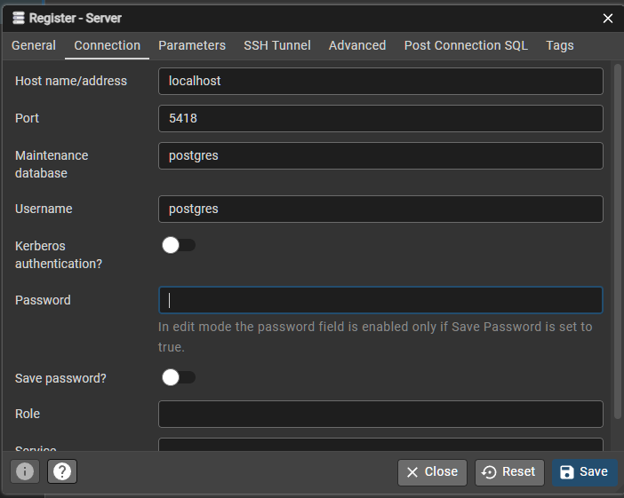 Note that I hav set the database server port to `5418` – which is easy to remember since it’s PosgreSQL 18, but we need to set it correctly when we need to connect to the server.