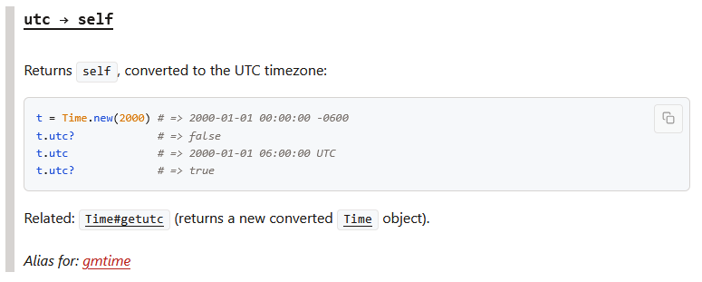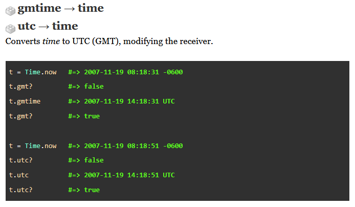 However, you need to know that .utc changes the object itself into the UTC timezone. It does not return a new object that is in UTC, leaving the original intact. It’s almost as if they should have called it utc! because it changes original object. Someone pointed out, though, that it’s expected that it’s not utc! since that’s usually only when there are two versions of a method and one is dangerous while the other one is not.
